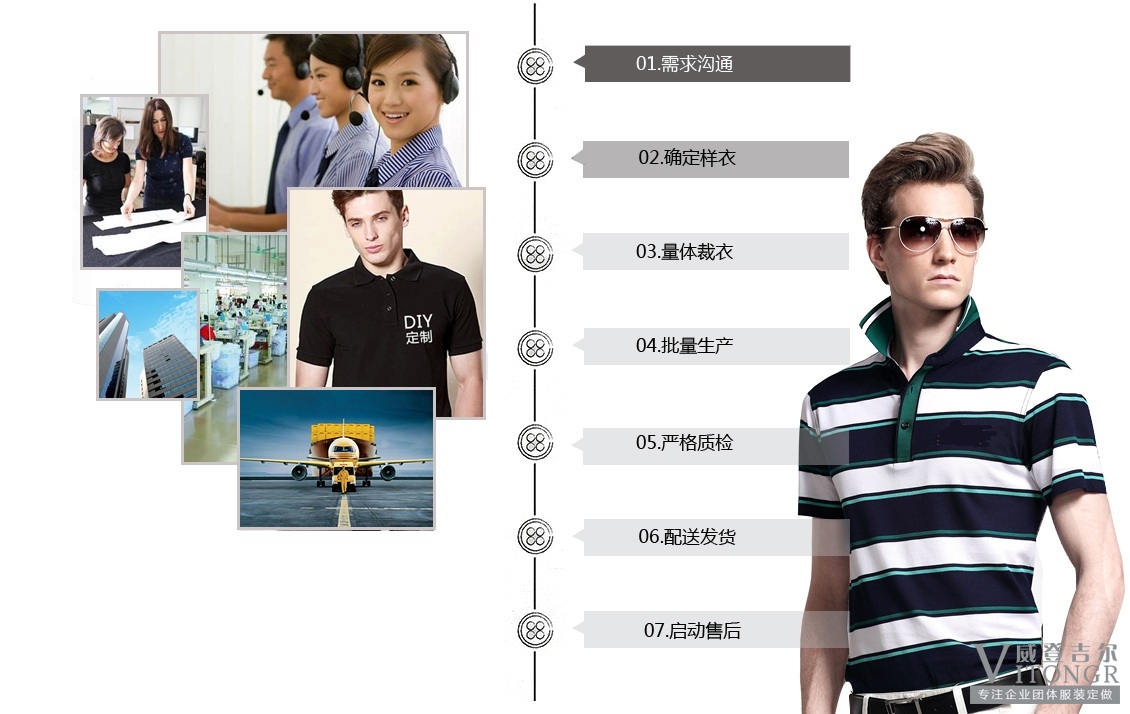 定做流程:業(yè)務(wù)溝通—寄送樣衣—確定款式—確定面料—確定價(jià)格—簽訂協(xié)議—支付定金—下單生產(chǎn)—包裝送貨—驗(yàn)收付款—售后服務(wù)。